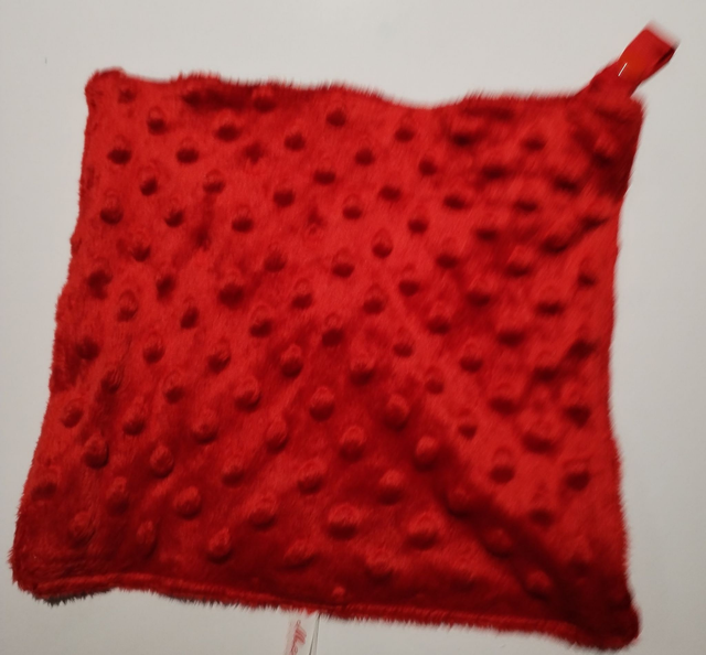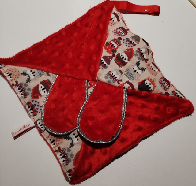 Doudou rouge avec tissu coton hibou et tissu minky rouge.