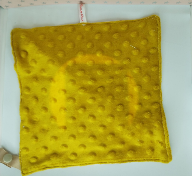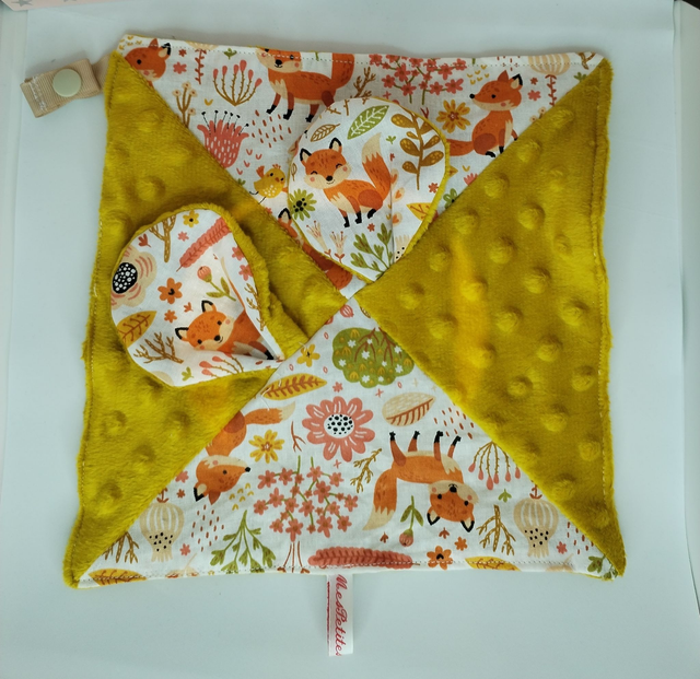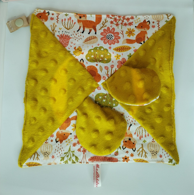 Doudou tissu coton avec renard et tissu Minky de couleur moutarde.